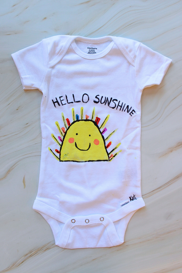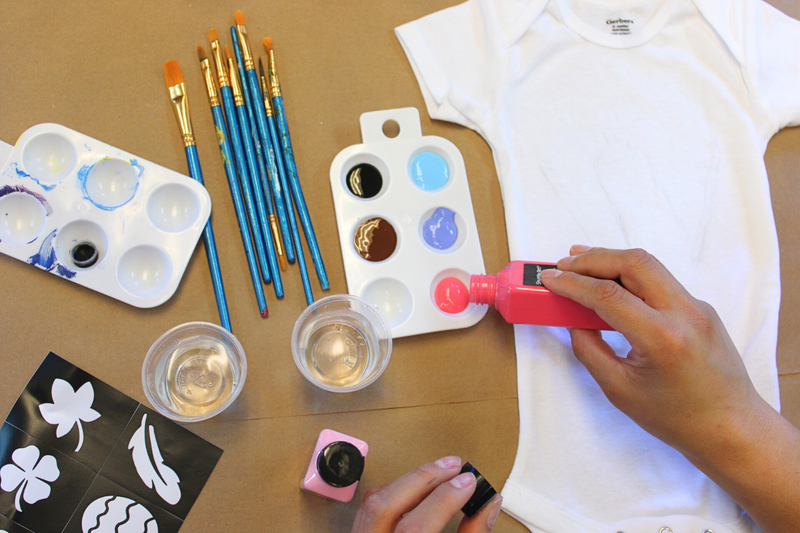 Kit Includes: plain onesies in various sizes, fabric paints, brushes, stencils, and instruction.