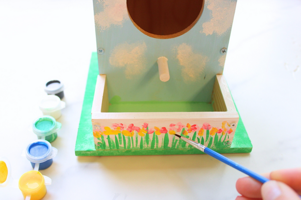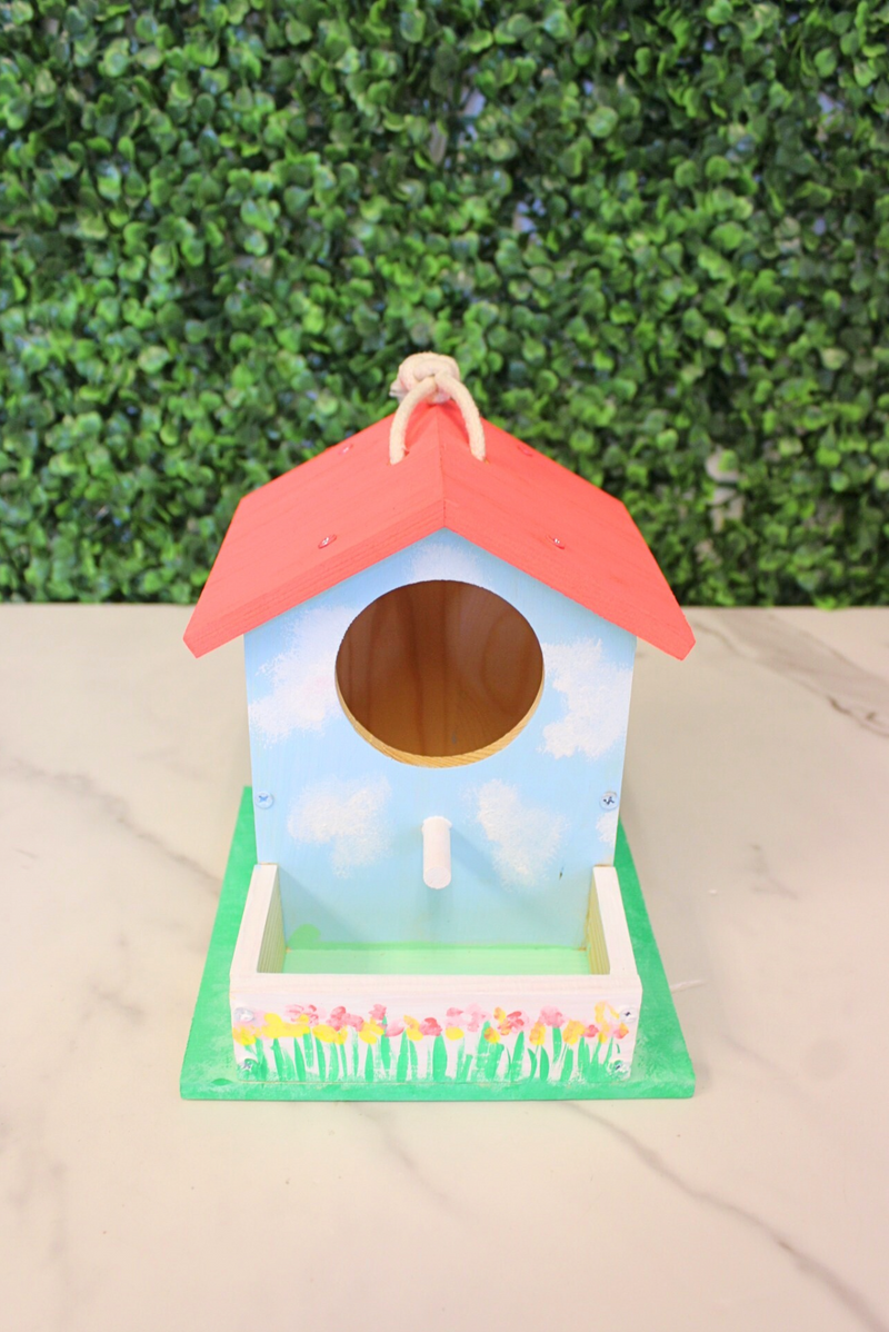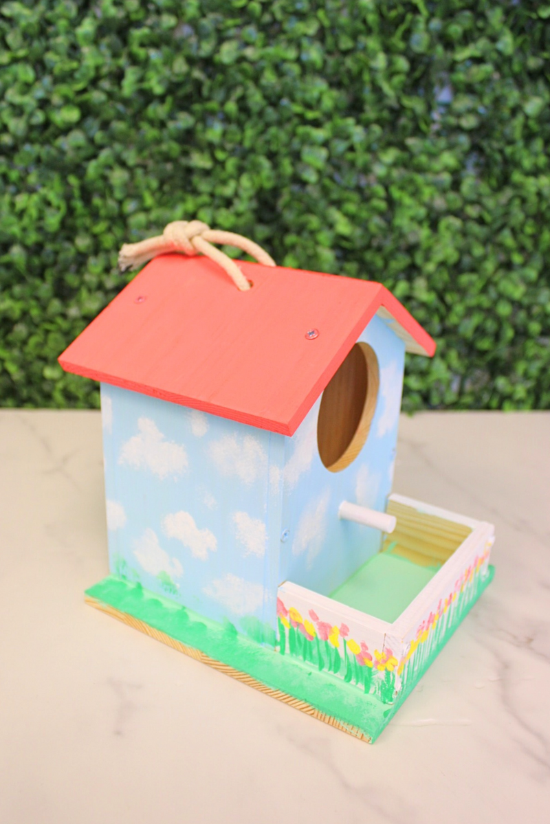 Kit Includes: 10 wooden boards, 1 perch wooden cylinder, small screwdriver, pack of mounting screws, twine, 2 paint brushes, 6 colors of paint, and instruction.