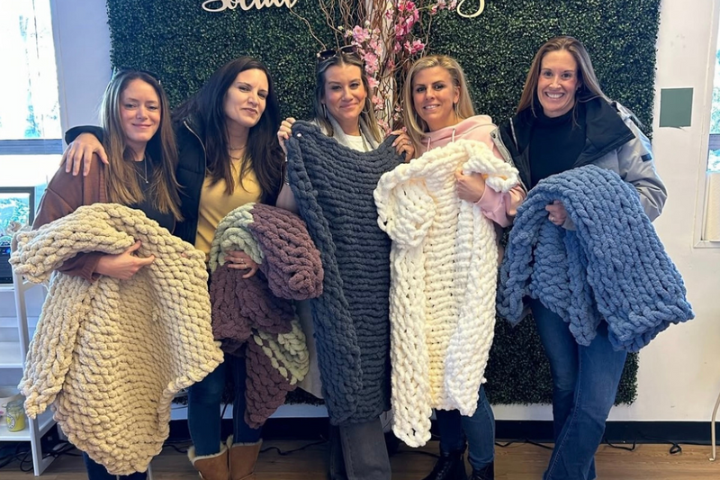 Get cozy and creative in our chunky blanket knitting workshop. The rhythmic and repetitive nature of knitting promotes relaxation and mindfulness which can aid in alleviating stress and anxiety. No knitting needed! Knitting also requires attention and concentration which further improves focus and attentiveness; making it the perfect craft experience for employee wellness.