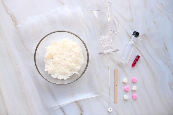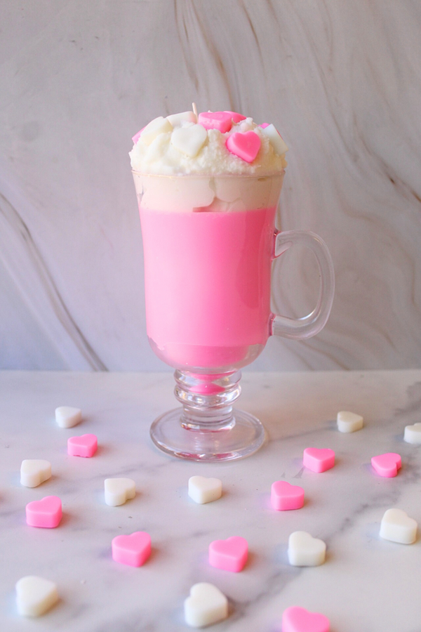 Kit Includes: Irish coffee glass, wax, mini wax hearts, boil bags, pink dye, scent, wick holder, wick, wick sticker, and gloves.