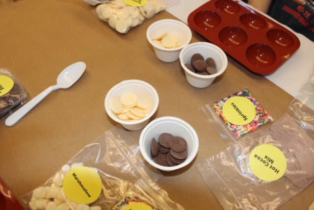 Kit Includes: Hot Cocoa mix, White and Milk Chocolate, Marshmallows, Sprinkles, Reusable Sphere Silicone Mold, Mixing cups, Popsicle sticks and Decorations.