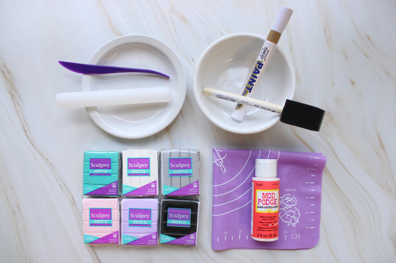 Kit Includes: 12 blocks of sculpy clay in various colors, knife, gloss glaze, tube roller, silicone mat, gold paint pen, foam brushes, and two different oven-safe dishes.