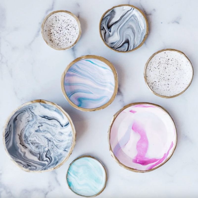 Join our Marbling Clay Dish Workshop, guided by skilled instructors, to create stunning and functional clay dishes. This kit includes high-quality clay in multiple colors, essential tools, and oven-safe bakeware. You'll learn fun and easy marbling techniques to craft unique pieces for holding jewelry, keys, office supplies, or accessories. The kit features 12 blocks of Sculpey Clay, a knife, gloss glaze, roller, and a gold paint pen for elegant finishing touches. Perfect for all skill levels, this workshop lets you create beautiful, personalized decor.