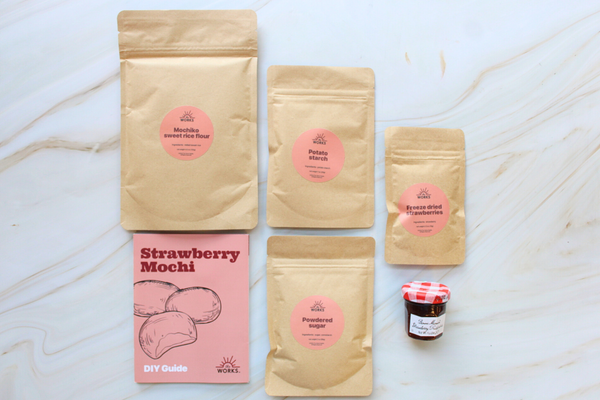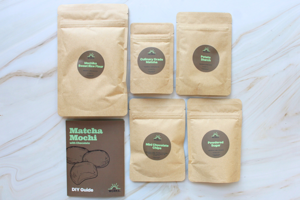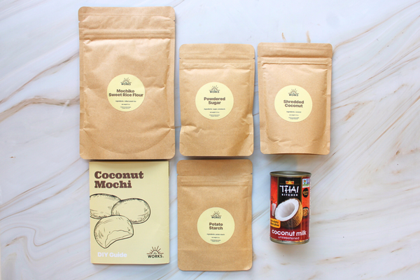 Kit Includes: a choice of the following flavors; strawberry, matcha, and coconut. Also included is mochiko sweet rice flour, powdered sugar, potato starch. and instruction. Only strawberry mochi includes freeze-dried strawberry powder and strawberry jam. Only the matcha mochi includes culinary-grade matcha and mini chocolate chips. Finally, only the coconut mochi includes shredded coconut. The following is not provided: you will need a cutting board, sharp knife, water, small bowl, fork, and either a microwave or stovetop.