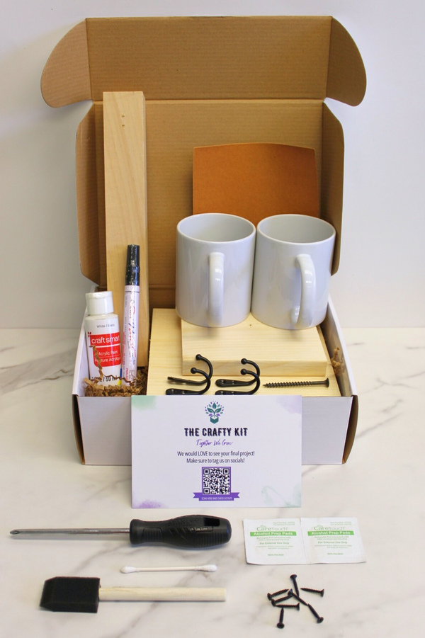 Kit Includes: precut wood pieces, sandpaper, white paint, a foam brush, mugs, a Q-Tip, hooks & screws, a deck screw, an oil-based Sharpie, a screwdriver, and an alcohol pad. Shipping is included with the kit, and virtual instruction is provided to guide your team through the creative process.