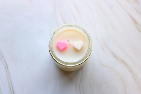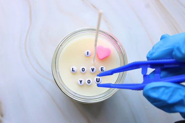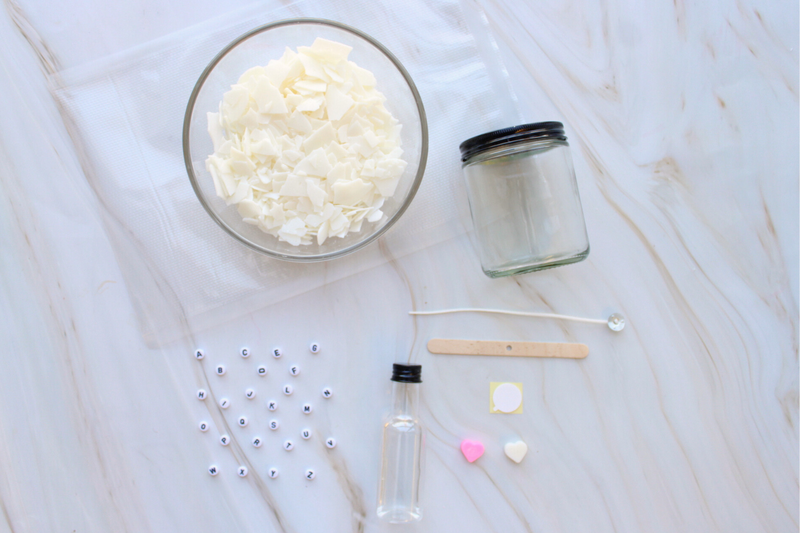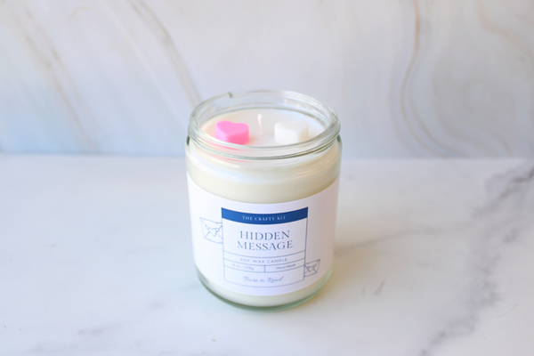 Kit Includes: Wax, wax sticker, wick, candle jar, scent, wax hearts, boil bag, gloves, sticker, and letter beads.