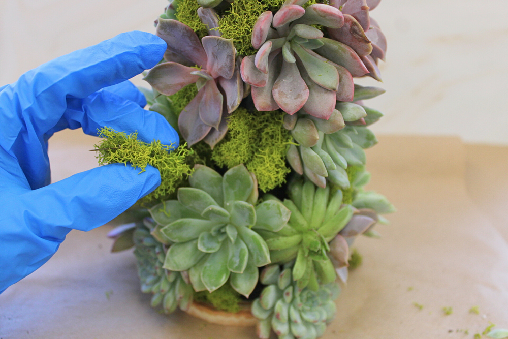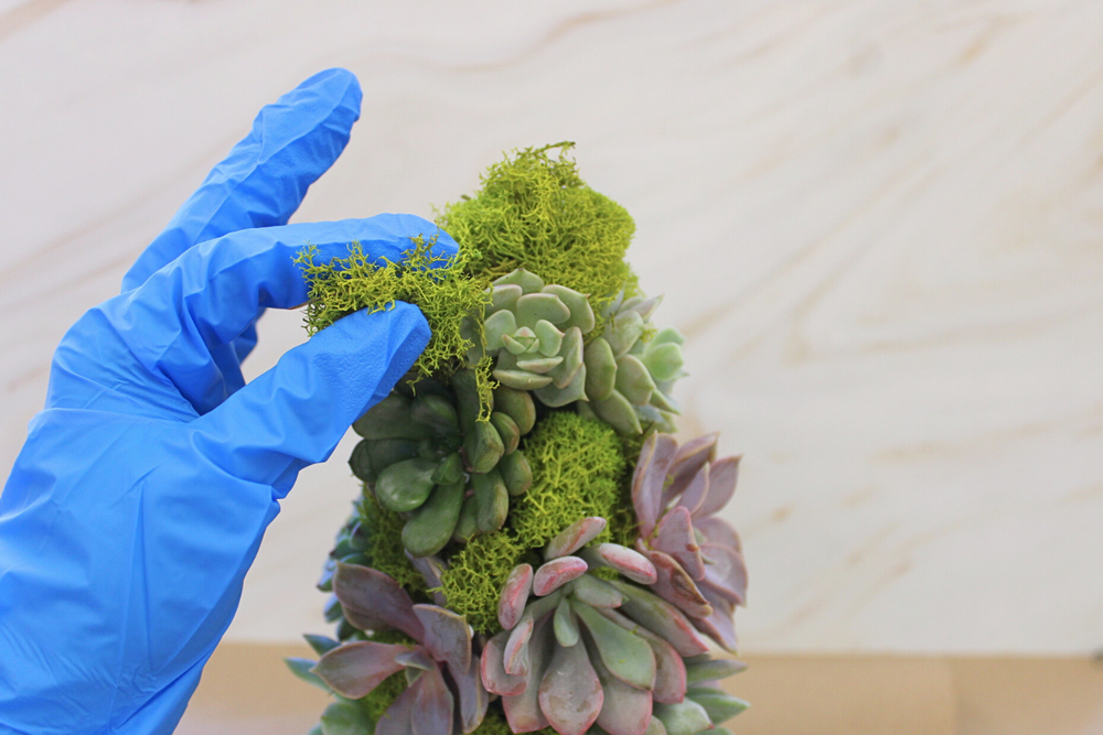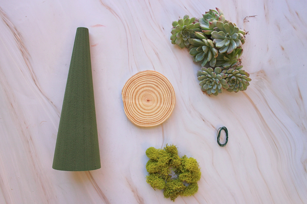 Kit Includes: Assortment of succulents, styrofoam cones, moss, pine cones, decorative star, glue gun.