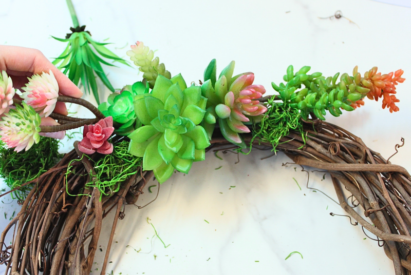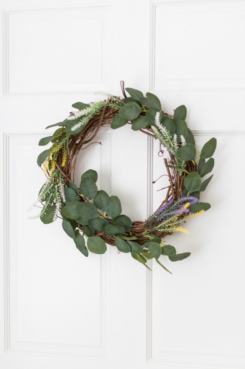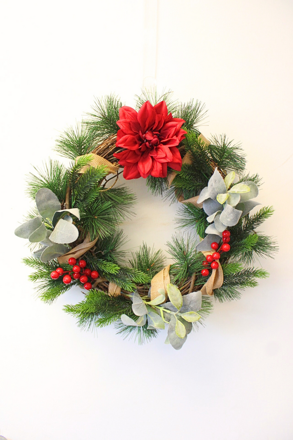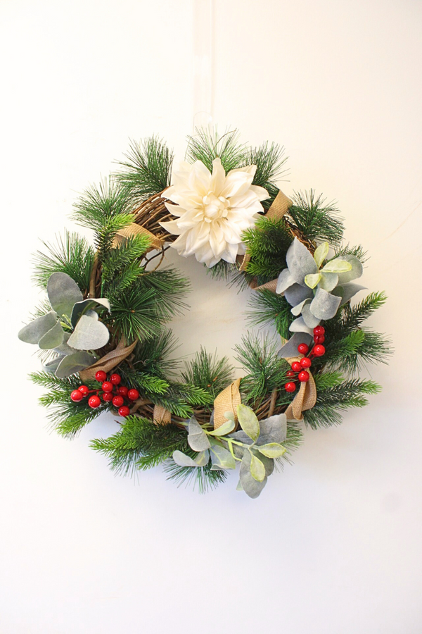 Kit Includes: 14 inch grapevine wreath, faux greenery, floral wire